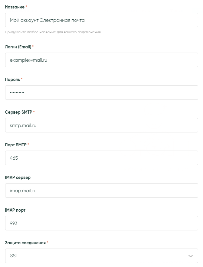 - Пароль: пароль сгенерированный в ЛК mail.ru для внешнего приложения