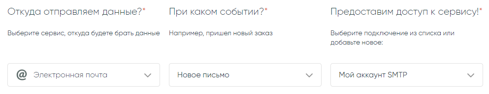 После этого останется только выбрать сервис куда будем передавать данные и указать какую информацию из письма в какие поля этого сервиса нужно передавать.