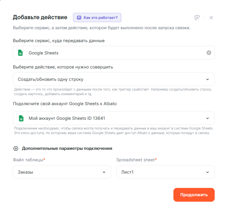 Также выберите нужный файл таблицы и лист, в который будут передаваться данные и нажмите Продолжить.