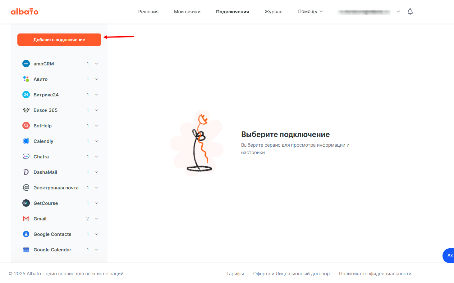 Далее перейдите в ваш кабинет Albato, Подключения, Добавить подключение.