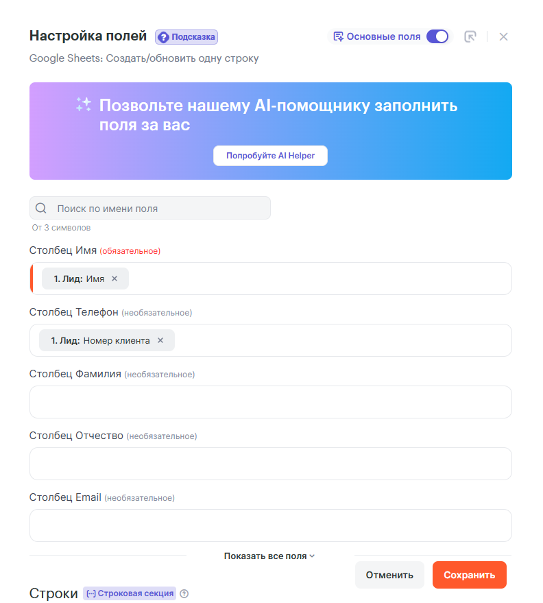 - Какое действие выполнить, когда запустится связка — Создать/обновить одну строку.