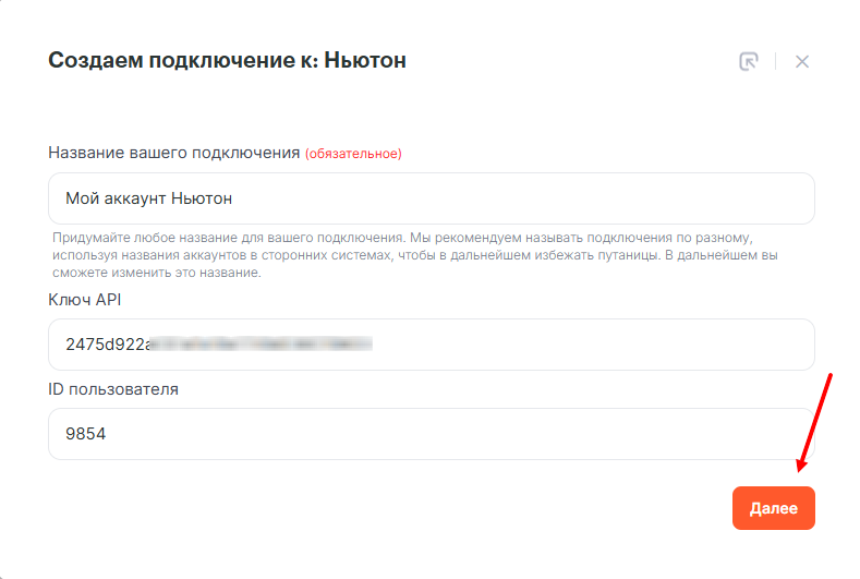 В открывшемся окне заполните поля Ключ API и ID Пользователя данными из Eyenewton и нажмите Далее.