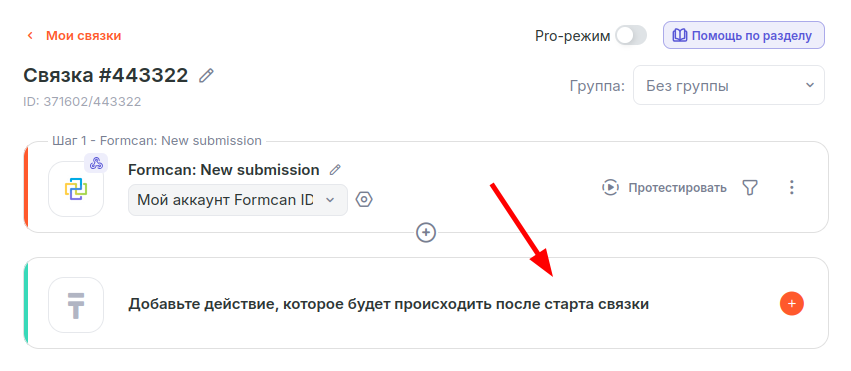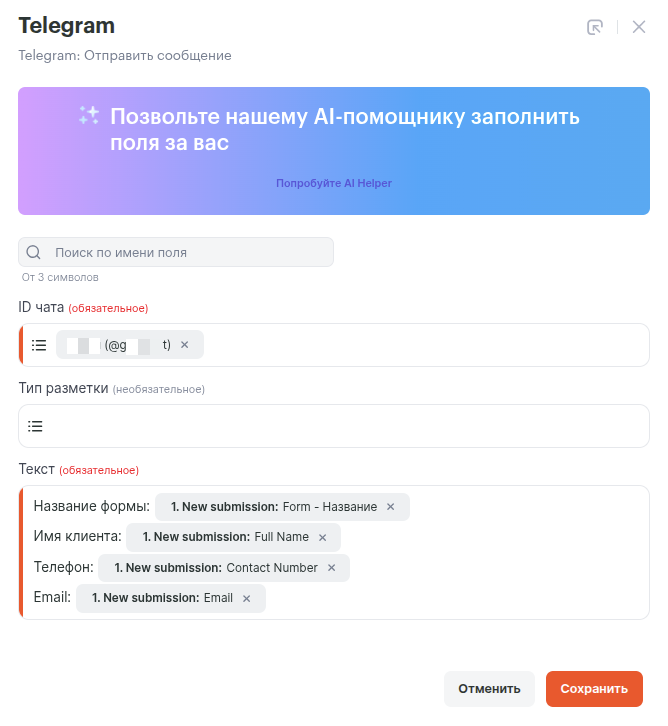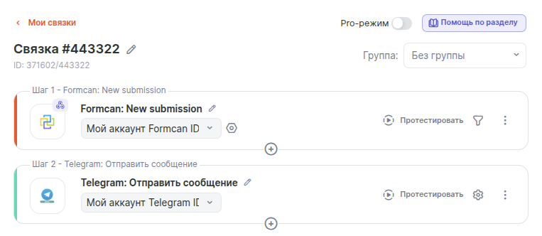Рассмотрим пример настройки связки для отправки сообщения в Telegram при заполнении формы Formcan.