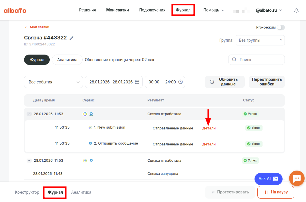 Результат работы связки можно посмотреть во вкладке Журнал. Нажав на Детали можно посмотреть какие данные были получены/переданы.