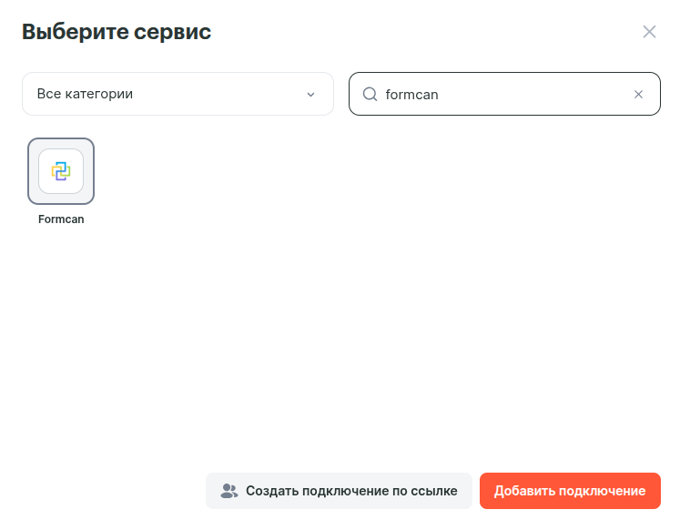 В новом окне можете воспользоваться поиском, чтобы быстро найти и выбрать сервис Formcan. Нажимаем «Добавить подключение».