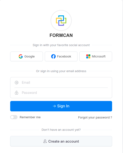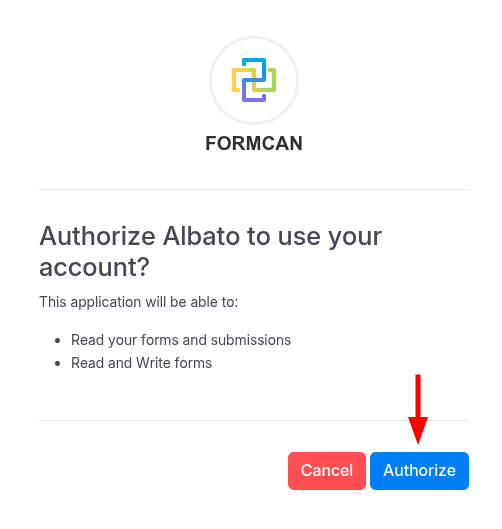 Появится всплывающее окно. Авторизуйтесь в своем аккаунте Formcan.