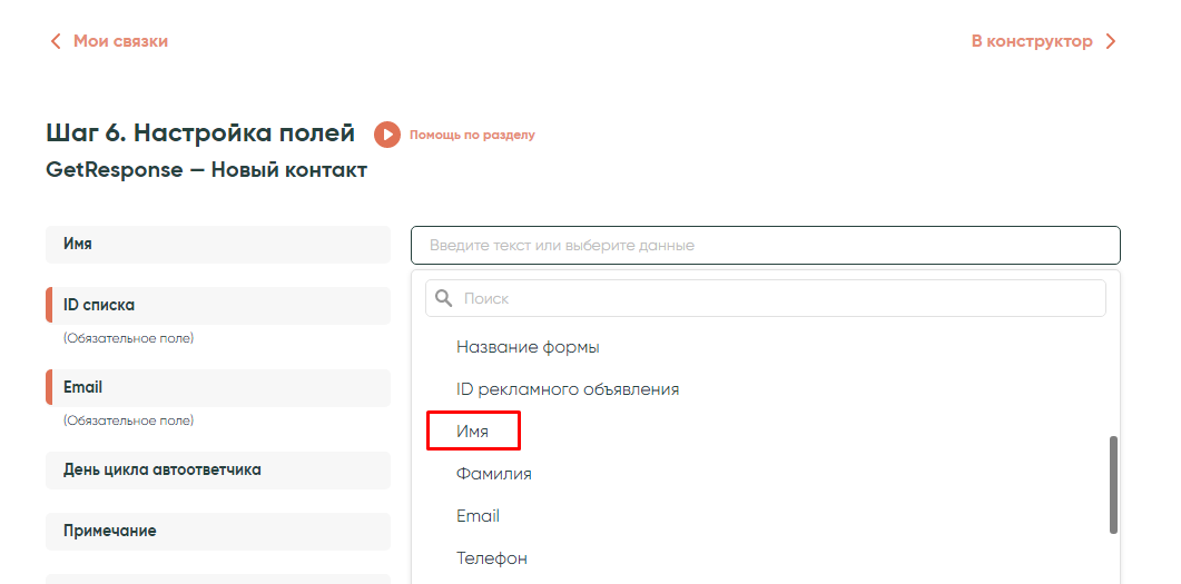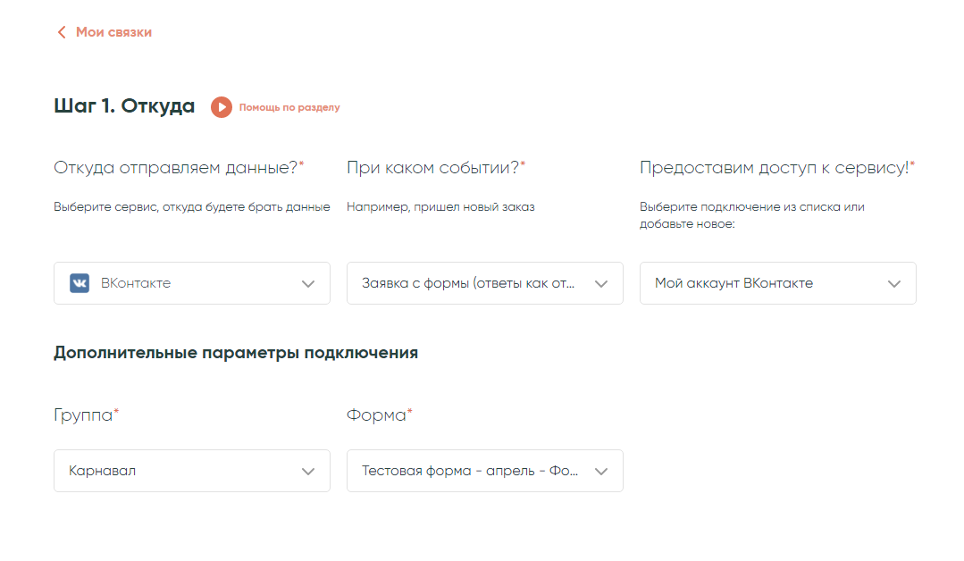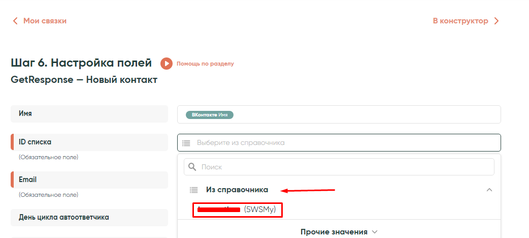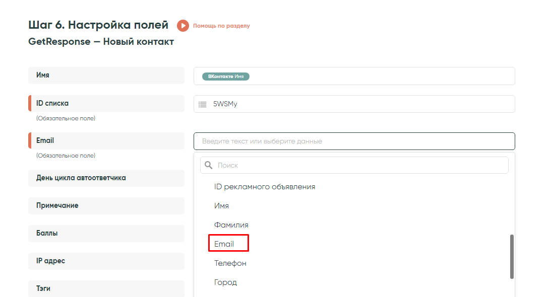 Создадим связку, которая при заполнении формы в ВКонтакте будет создавать контакт в GetResponse.