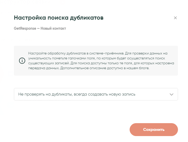 Сохраняем настройки и переходим к следующему шагу — проверке на дубли. Выбираем вариант — Не проверять на дубликаты, всегда создавать новую запись. Данный сценарий подразумевает — создание нового контакта в GetResponse при каждом заполнении формы в ВКонтакте. О других сценариях можно прочитать тут.