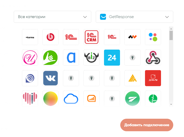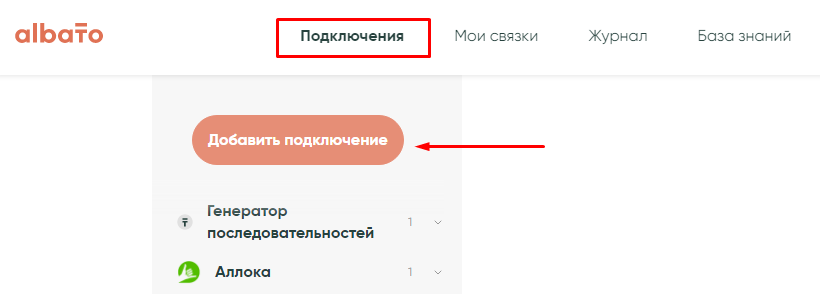 Для использования сервиса GetResponse необходимо его подключить к Альбато, для этго на главной странице выбираем вкладку «Подключения» — «Добавить».