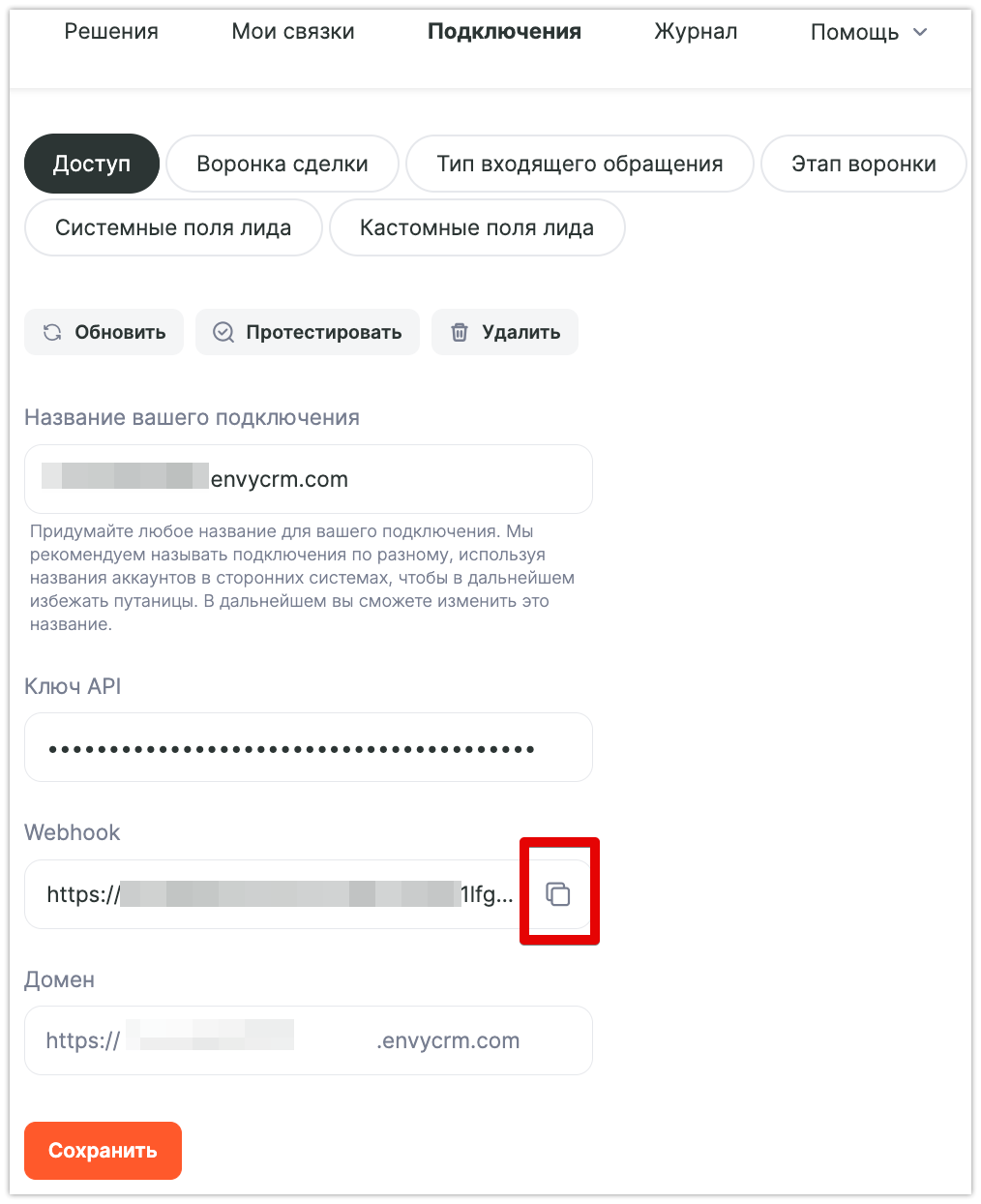 - Домен — копируем из адресной строки в самой EnvyCRM