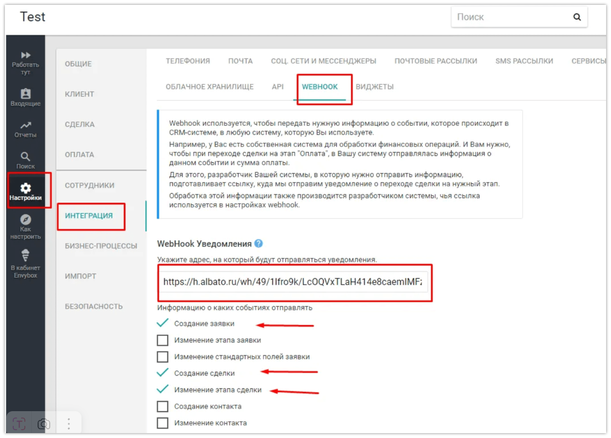 И переходим в EnvyCRM: Настройки – Интеграция – Webhooks, в строке “адрес” – вставляем скопированный вебхук и проставляем по каким событиям можно передавать данные: