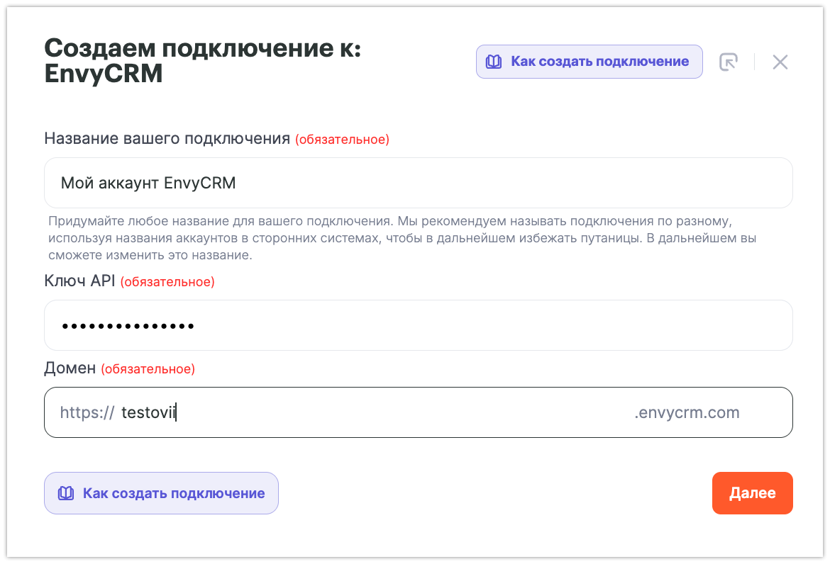 Нажимаем “Далее” и переходим к следующему шагу в создании подключения – пропишем вебхук на стороне EnvyCRM.