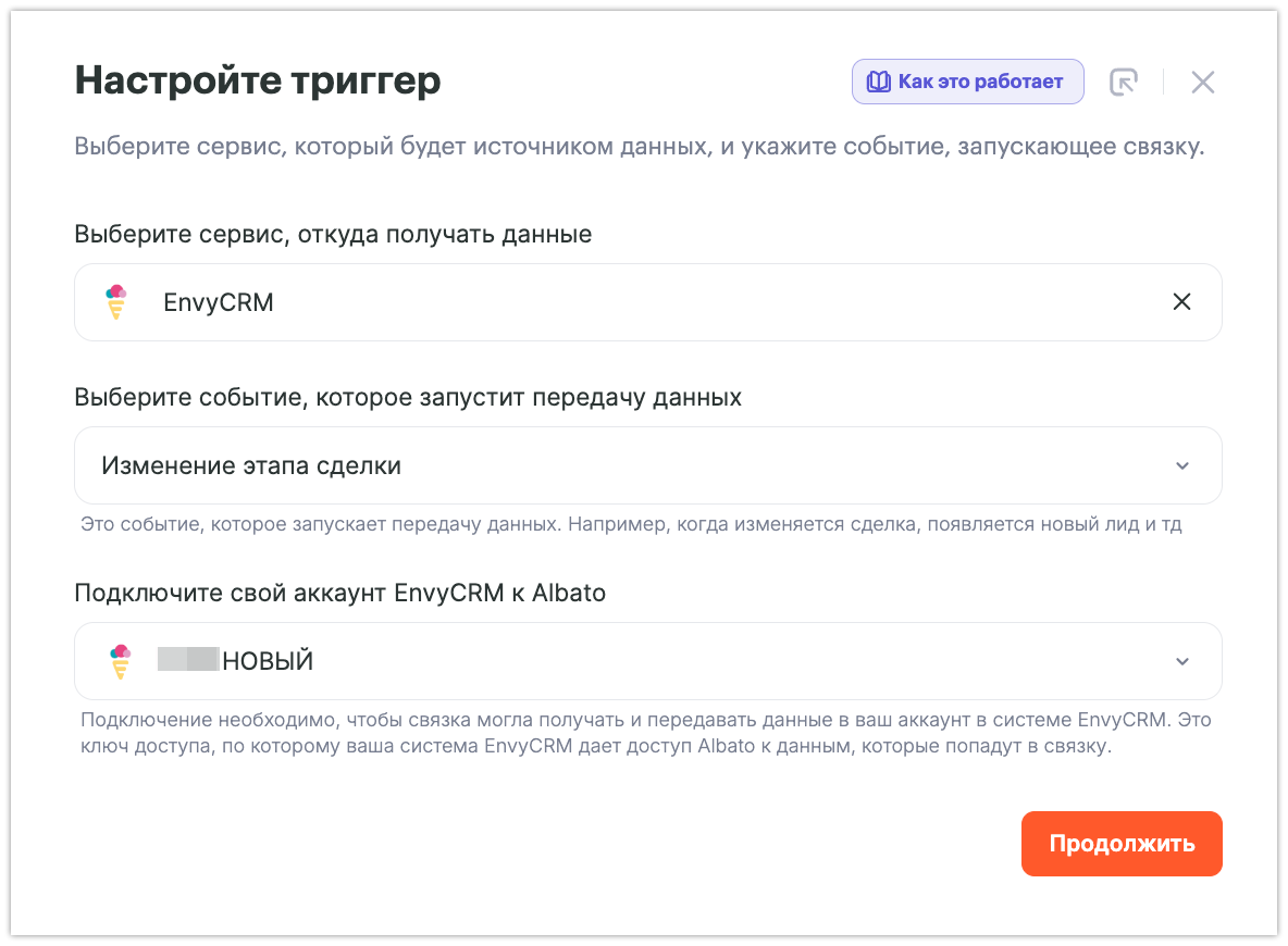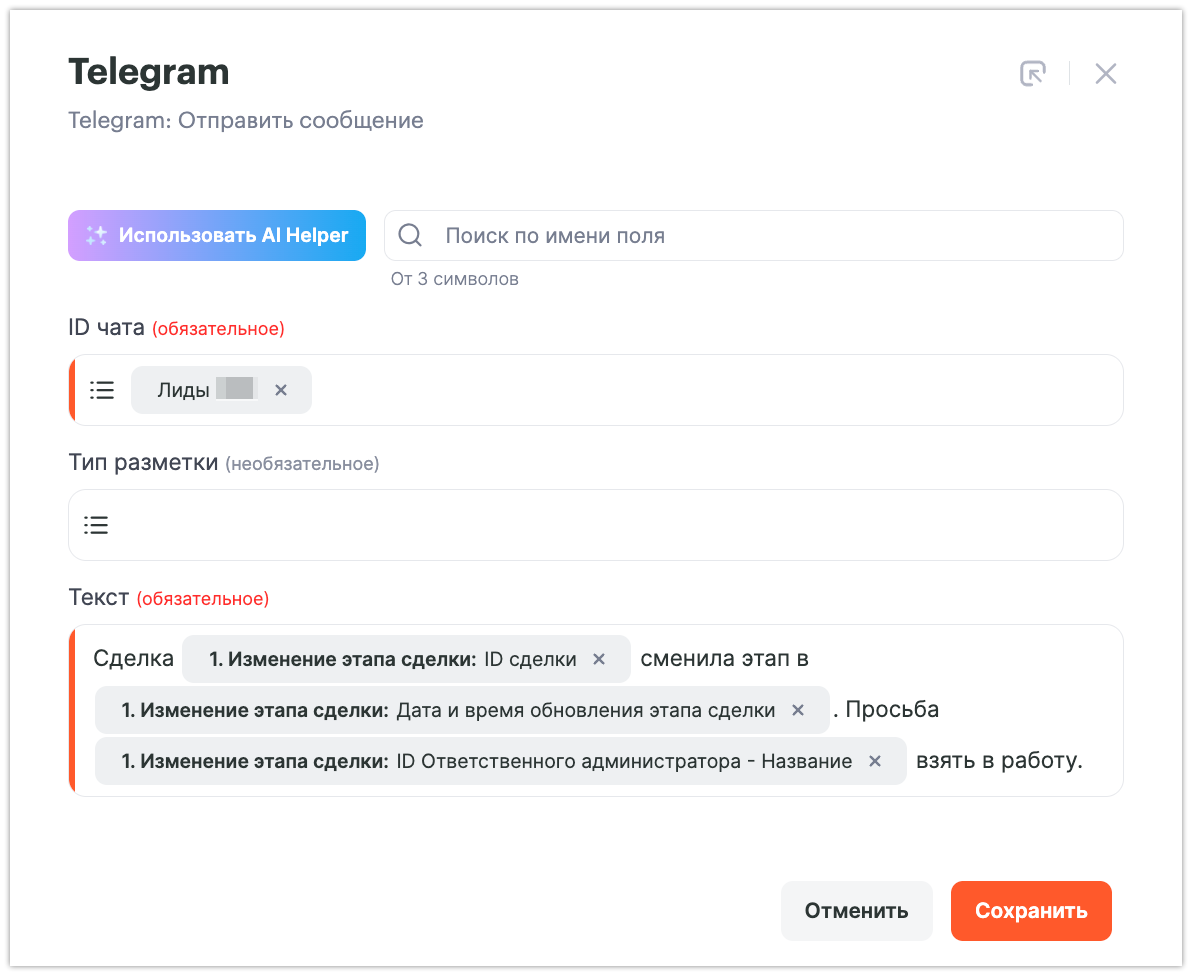 Рассмотрим пример создания связки, которая будет передавать данные из EnvyCRM при изменении этапа сделки в Telegram.