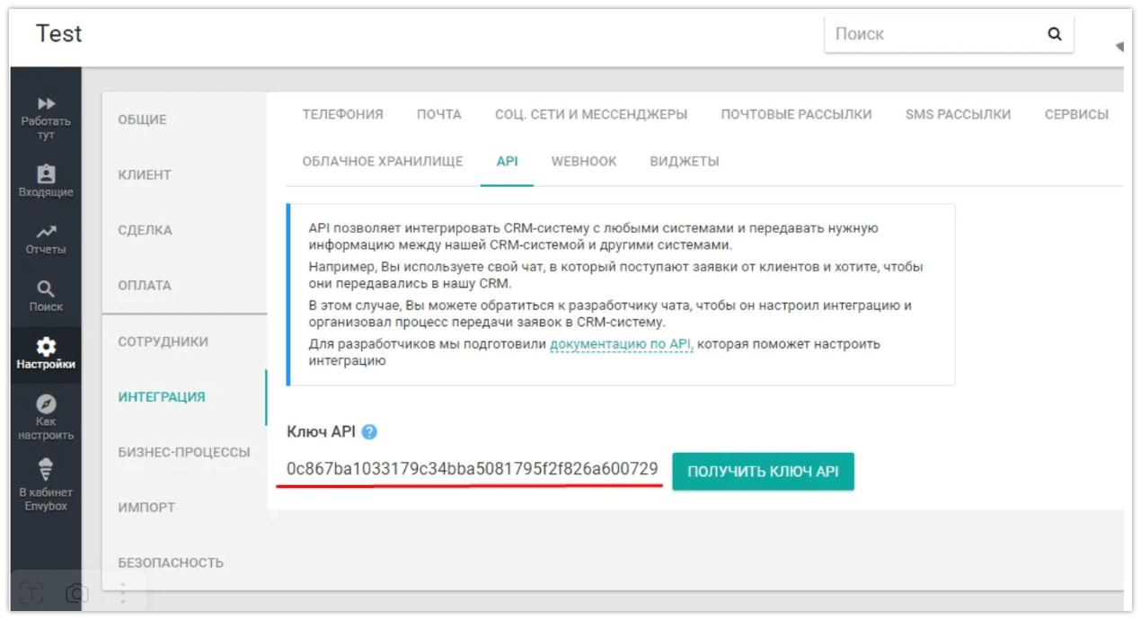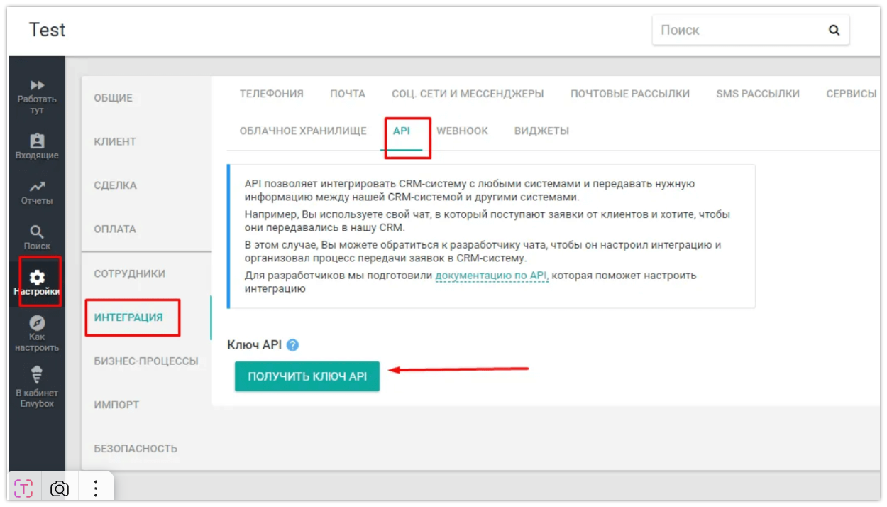- Для получения Ключ API переходим в EnvyCRM: Настройки – Интеграция – API – Получить ключ