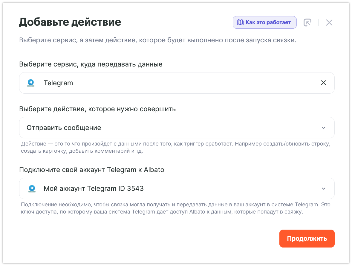 Копируем ключ и возвращаемся в кабинет Albato, заполненные поля выглядят так: