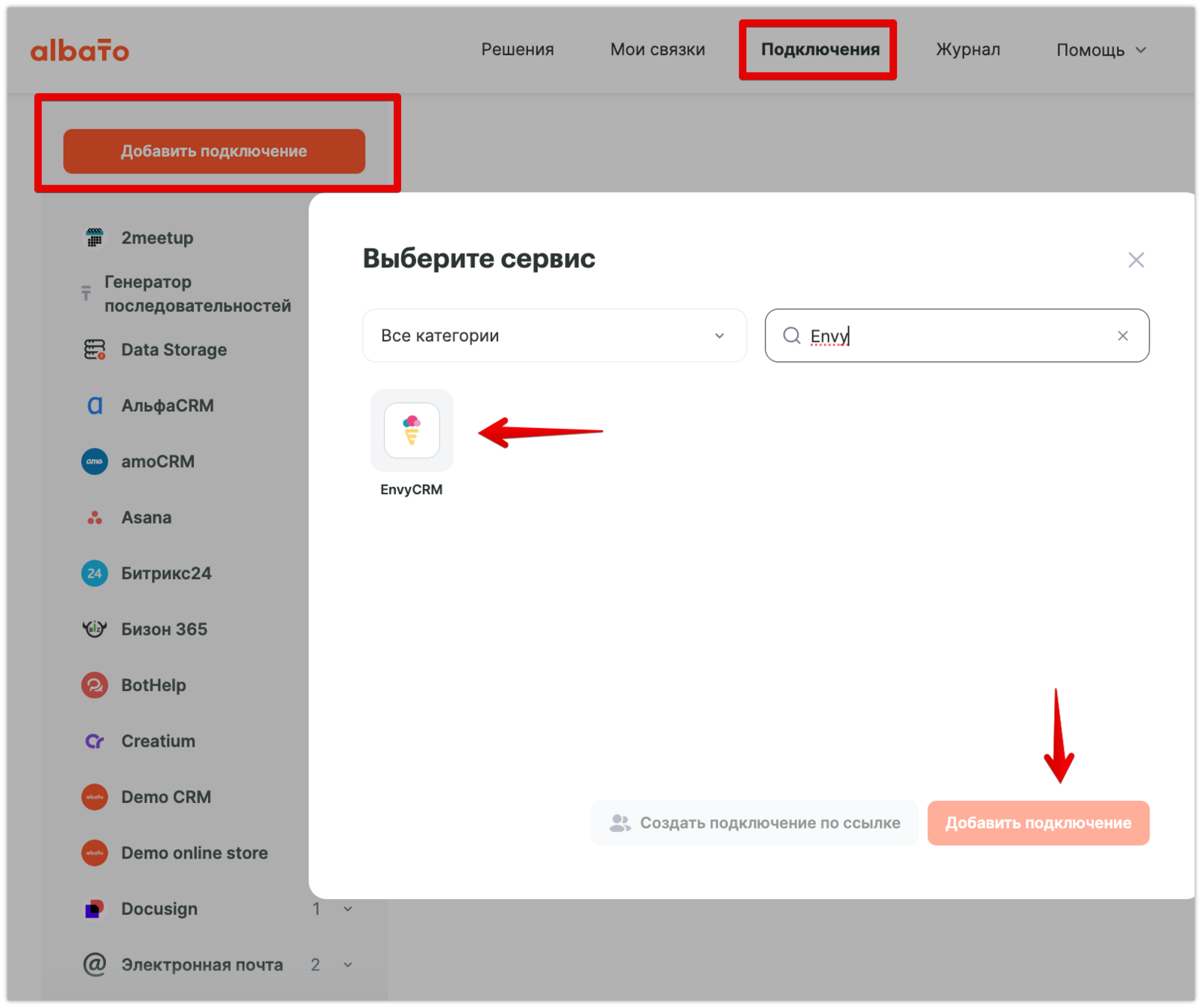 Для использования EnvyCRM необходимо подключить ее к Albato, для этого во вкладке “Подключения” нажимаем “Добавить подключение” и в появившемся окне выбираем EnvyCRM: