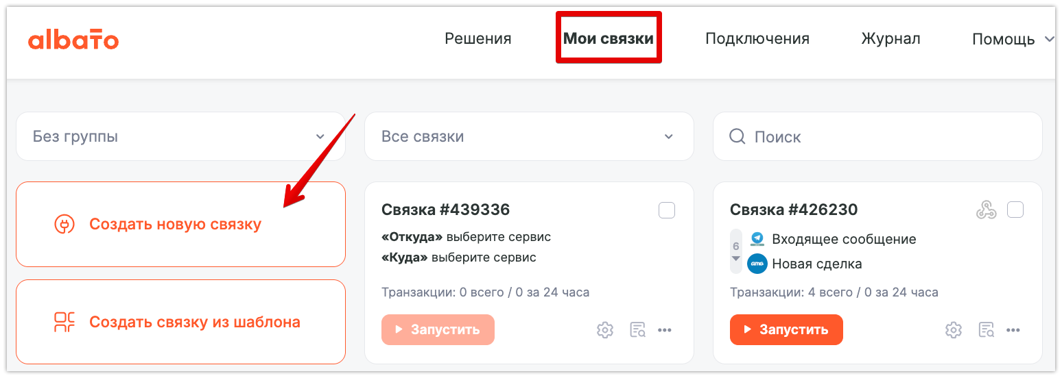 В личном кабинете Albato во вкладке “Мои связки” нажимаем “Создать новую связку”: