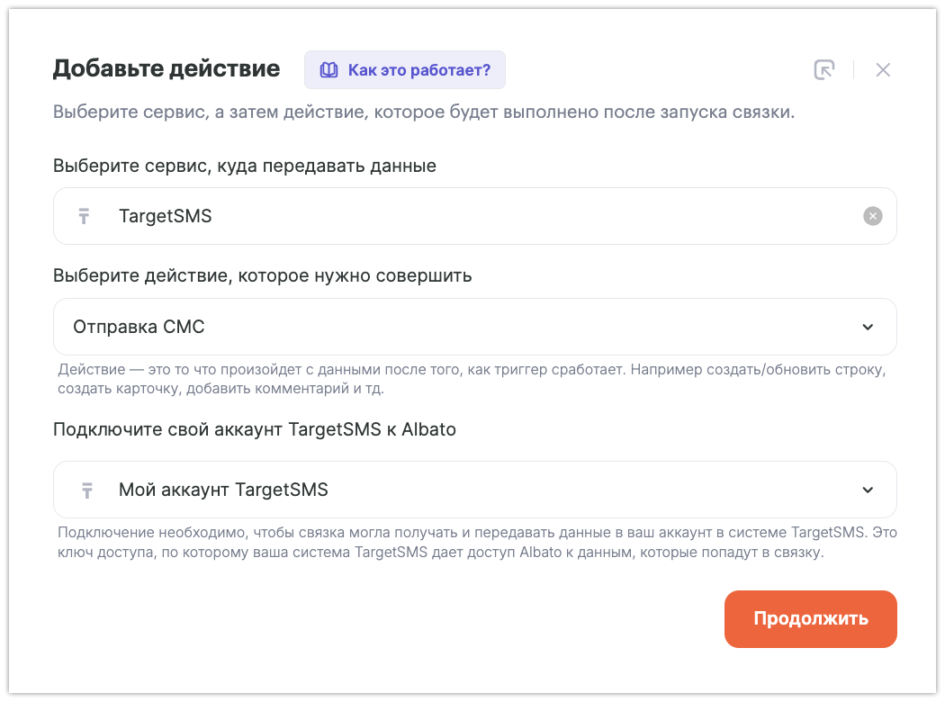 Далее добавляем шаг с действием — TargetSMS: отправить сообщение: