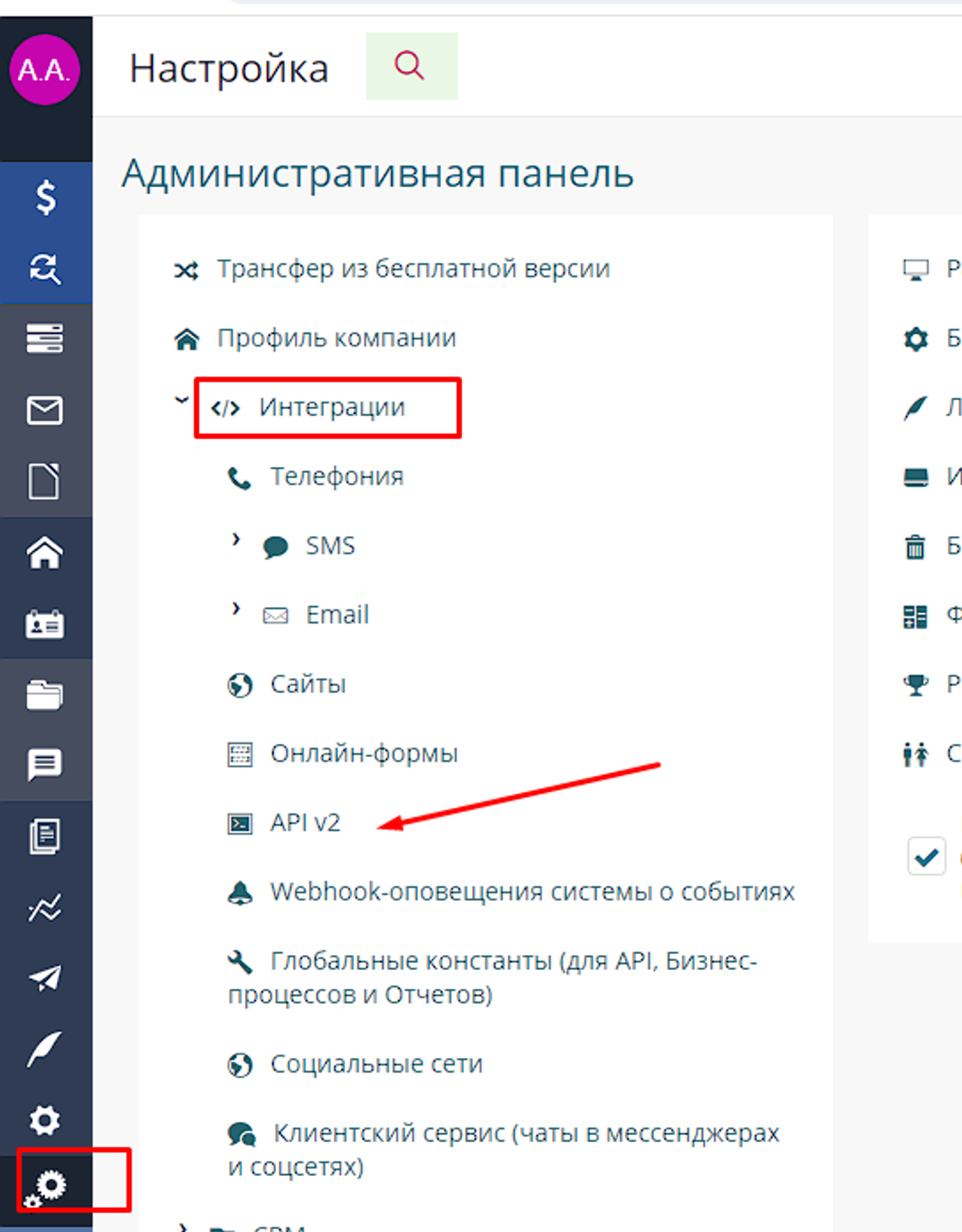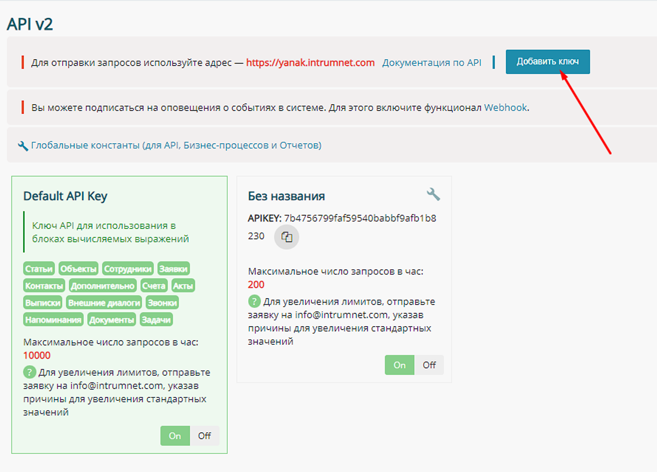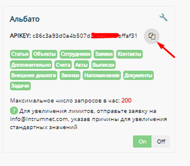 • Ключ API — переходим в Intrum Настройка — Интеграции — API