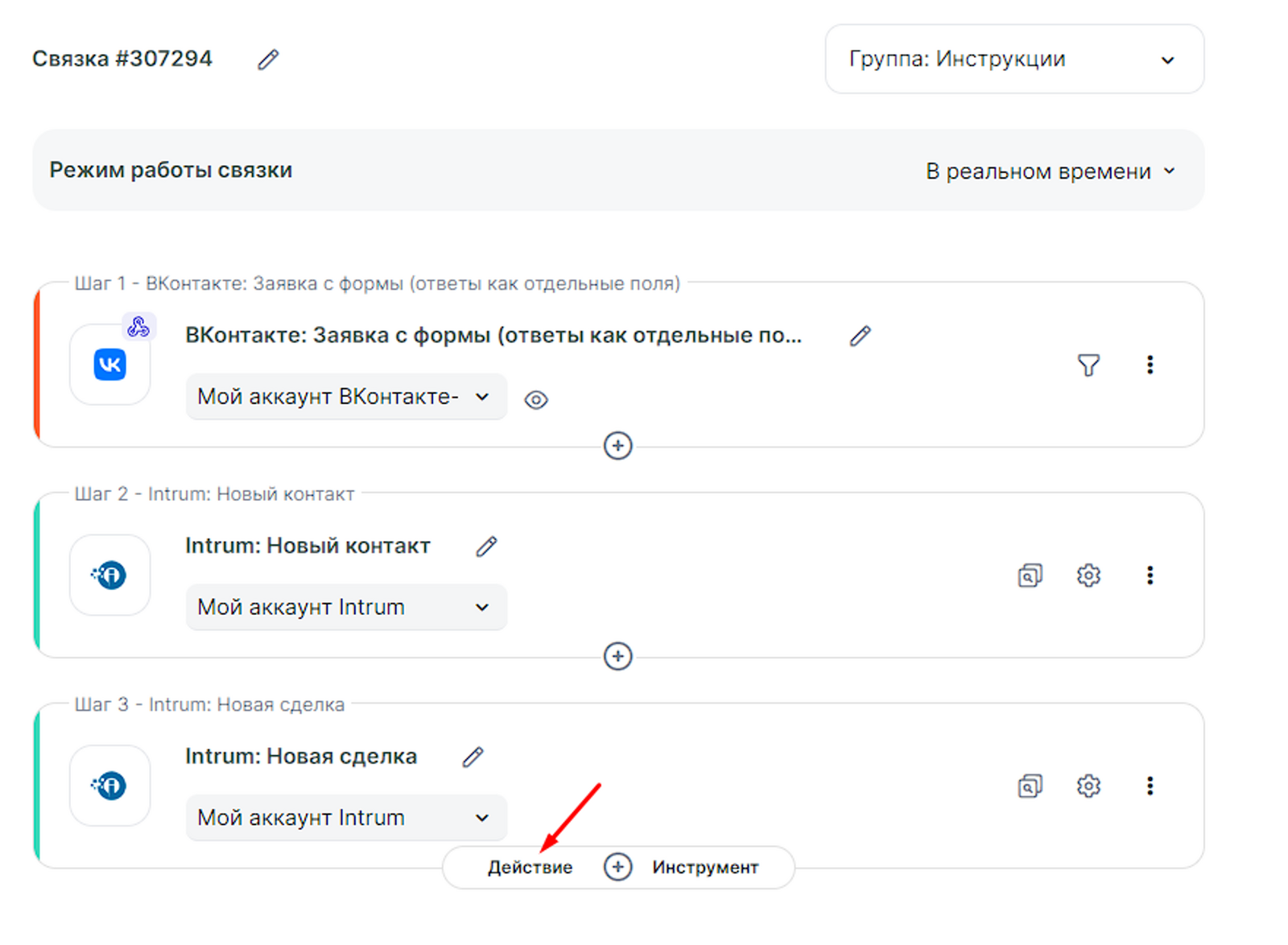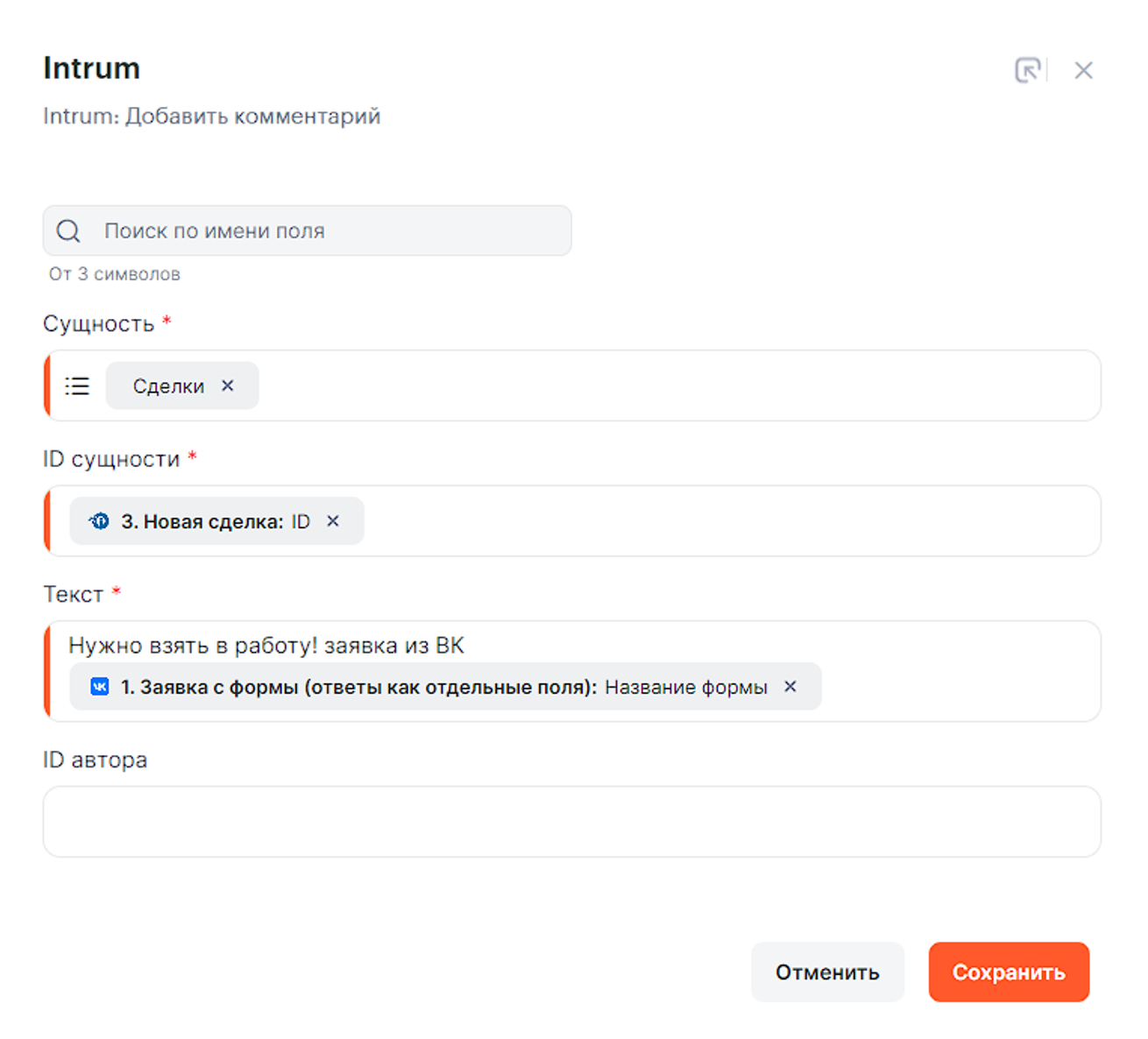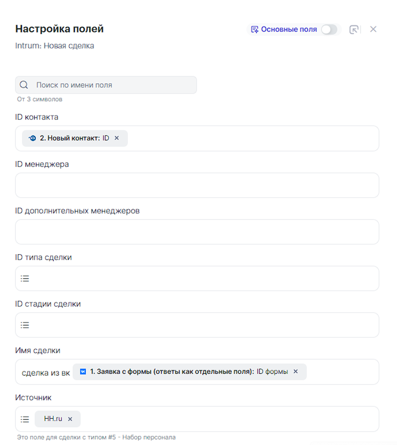 • Имя сделки — можно прописать статично и/или использовать параметры от шага 2