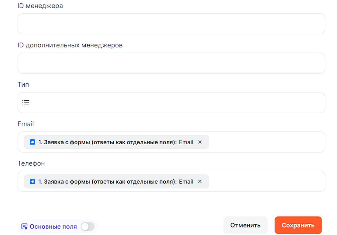 • Имя, Телефон и Email — выбираем из шага 1