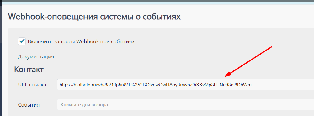 Вставьте вебхук из Albato в поле для URL в нужных строках, а так же выберите нужные вам события и сохраните прогресс.