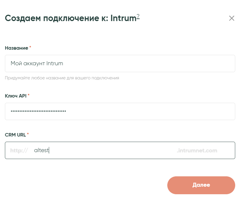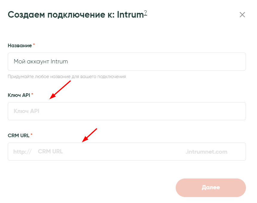 Теперь нужно выбрать название для подключение и заполнить поля «Ключ API» и «CRM URL».