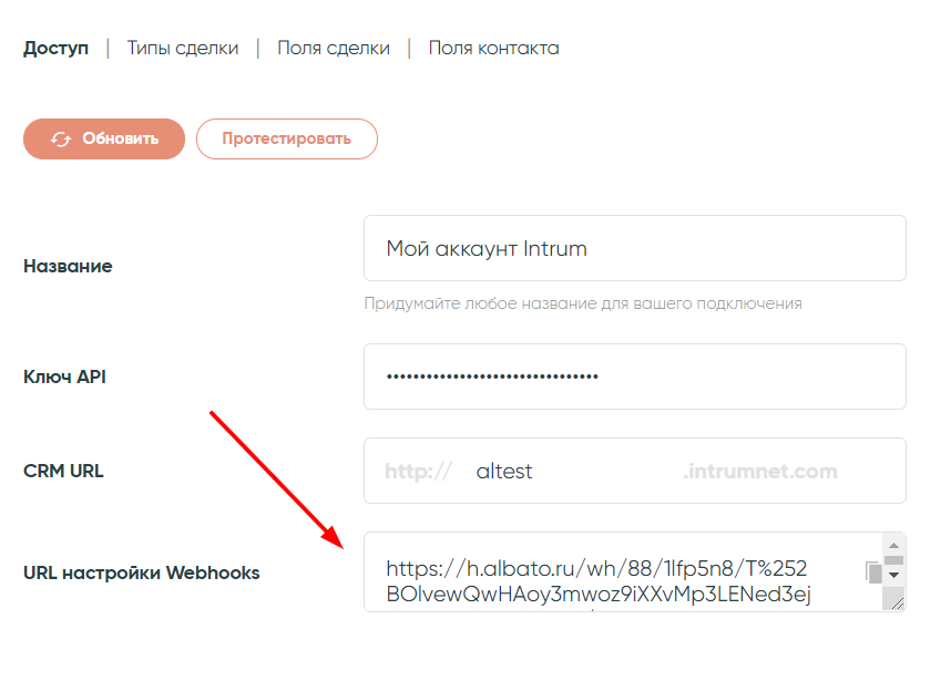 Кроме этого, на этом этапе можно настроить другой тип передачи данных в реальном времени. Albato генерирует вебхук, который также может пригодиться при определенных настройках сервиса. Скопируем это значение и вернемся в «Настройки» -> «Интеграции» -> «API v2».