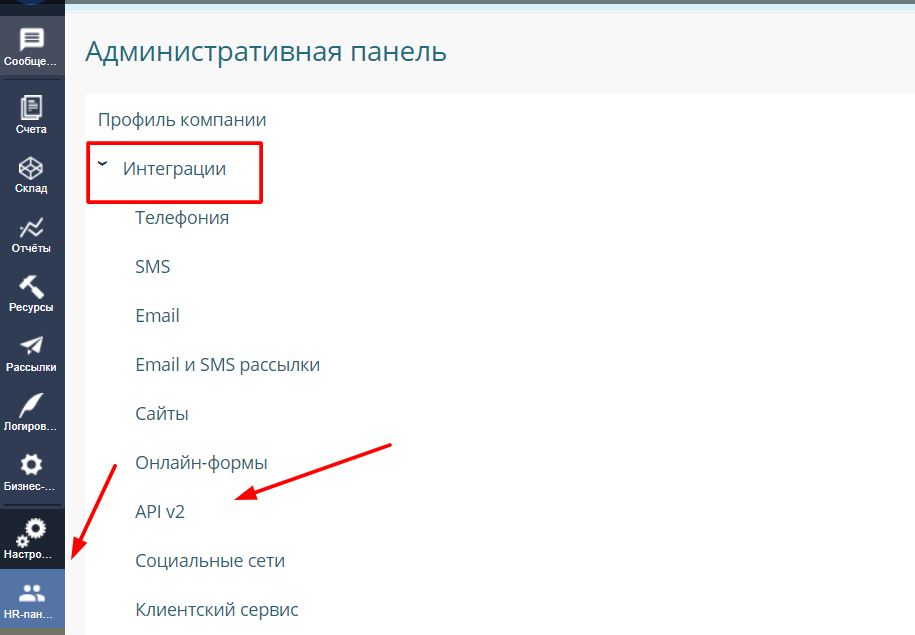 Наш путь состоит из трех остановок: «Настройки» -> «Интеграции» -> «API v2».