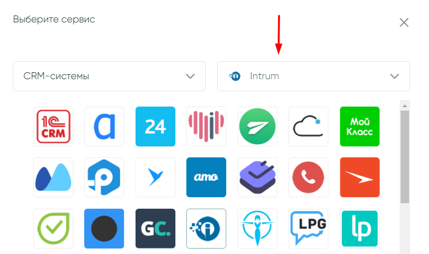 На новом экране выберите категорию сервисов CRM-системы и кликните по логотипу Intrum или воспользуйтесь поисковой строкой, чтобы быстрее найти сервис.