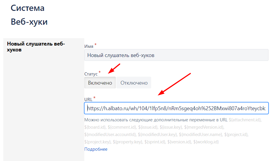 На новом экране в поле URL скопируем вебхук из вашего подключения к Albato: