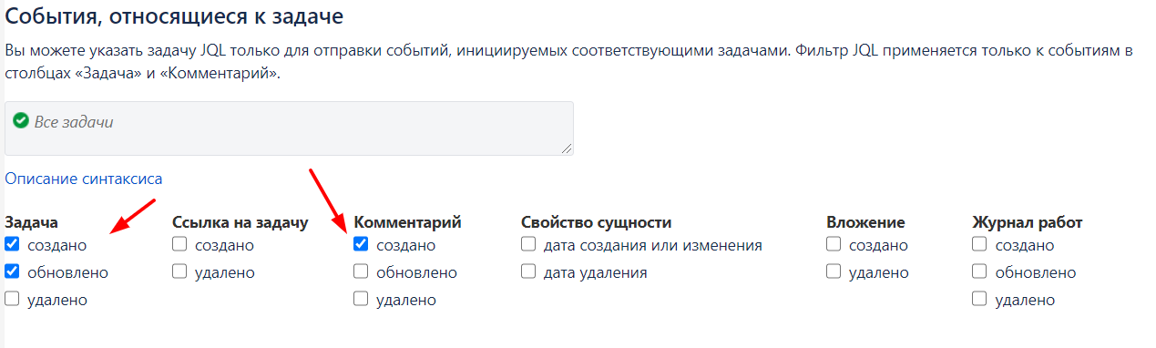 Кроме этого, проверьте, чтобы интеграция была включена. Проставьте галочки на «Комментарий — создано» и на «Задачи — создано, обновлено»