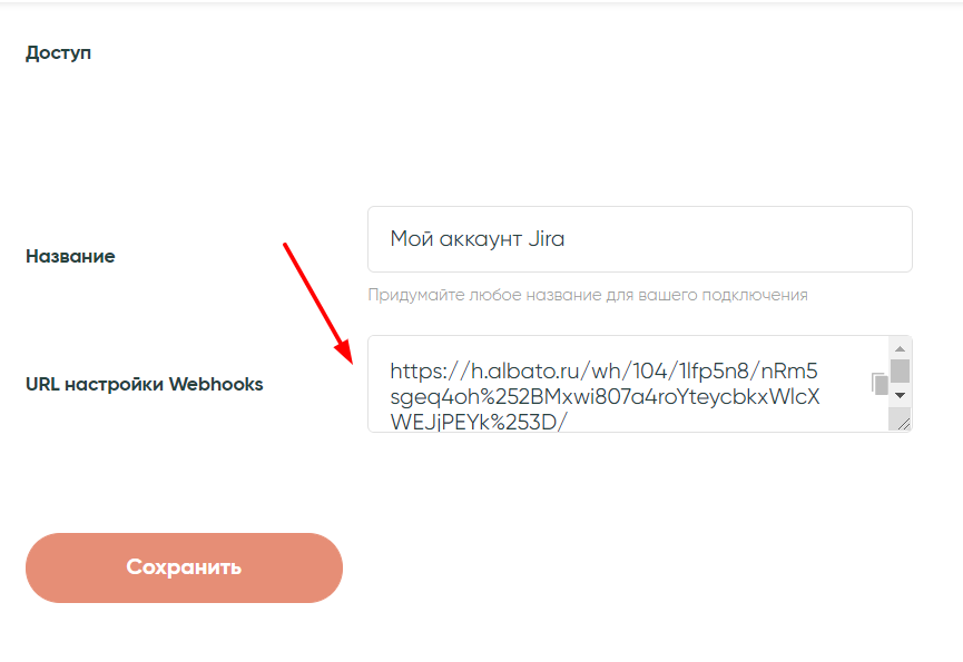На этом этапе Albato сгенерирует вебхук, который мы должны скопировать, чтобы перенести его в наш аккаунт Jira.