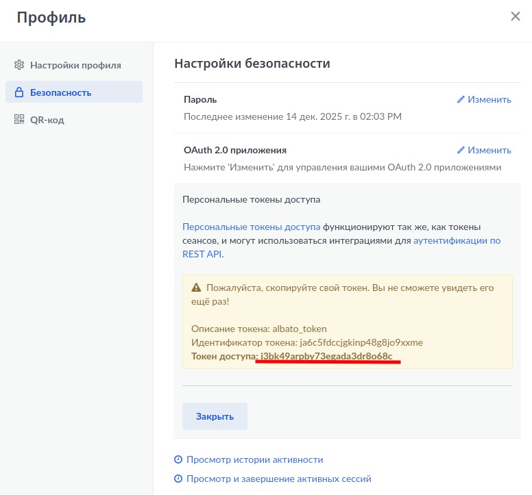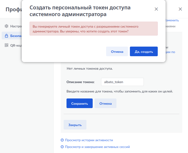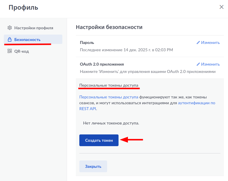 Выбираем раздел Безопасность → Персональные токены доступа → Создать Токен.
