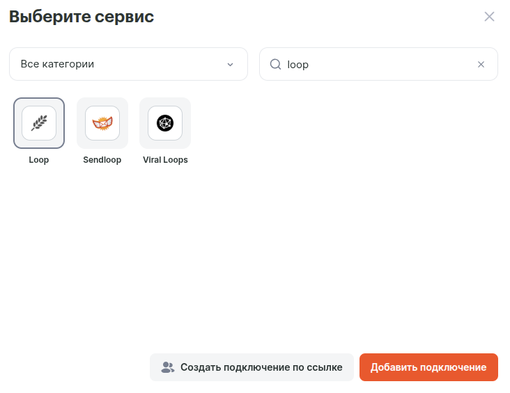 В новом окне можете воспользоваться поиском, чтобы быстро найти и выбрать сервис Loop. Нажимаем «Добавить подключение».