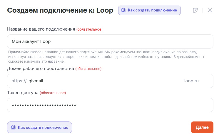 Указываем Токен доступа и Домен рабочего пространства → Далее.