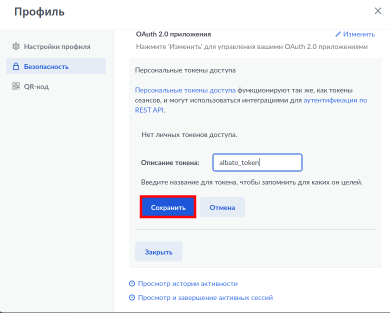 В поле Описание токена вводим название для токена → Сохранить.