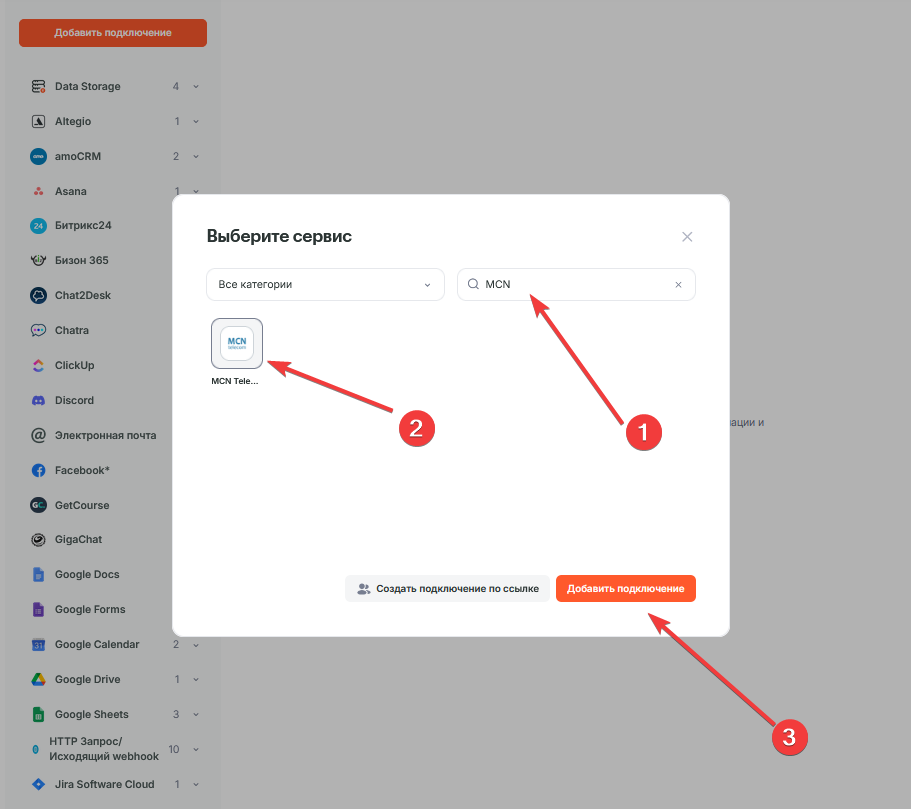 В поисковой строке появившегося окна укажите название сервиса — MCN Telecom. После чего, нажмите на его изображение и кнопку “Добавить подключение“.