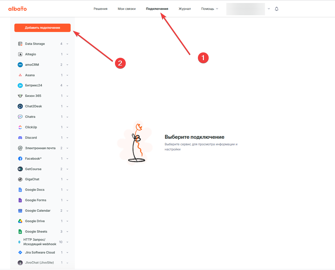 Для создания нового подключения с сервисом MCN Telecom перейдите в раздел “Подключения” и нажмите на кнопку “Добавить подключение“.