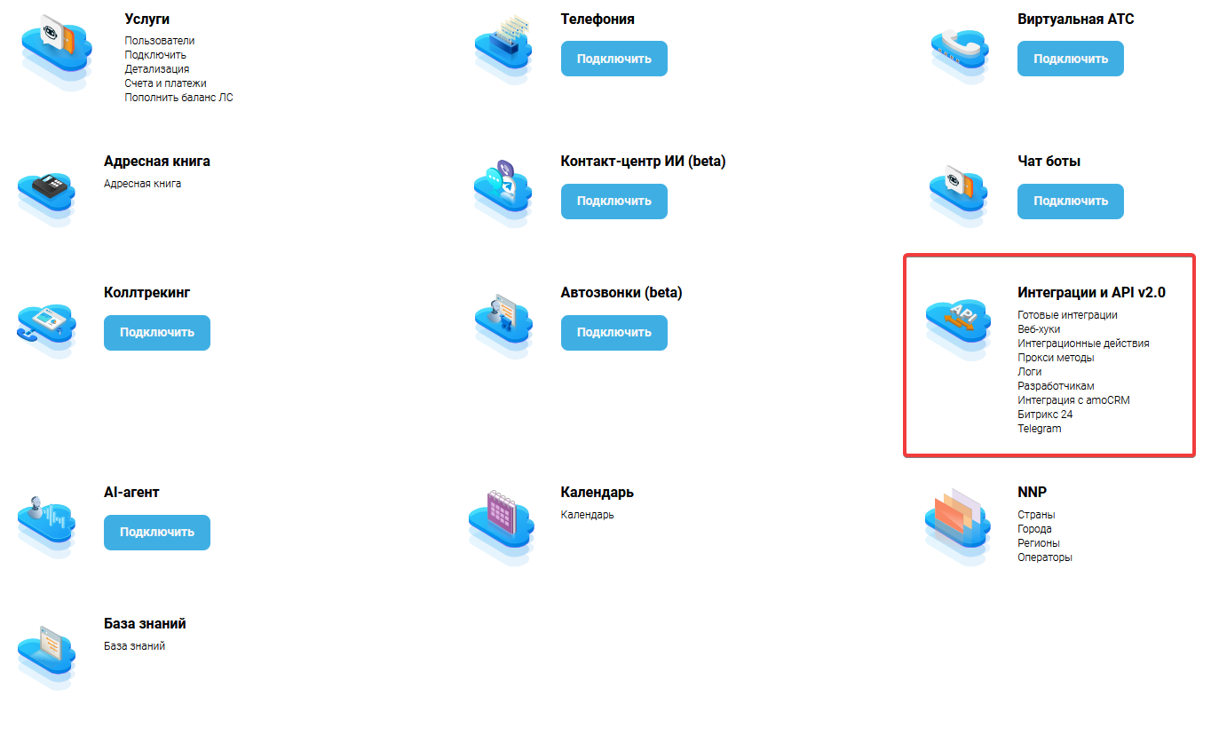 Чтобы получить токен доступа, вернемся на сайт сервиса MCN Telecom и перейдем на главную страницу. На ней обратите внимание на раздел “Интеграции и API v2.0”, в котором нажмите на любой предложенный подраздел.