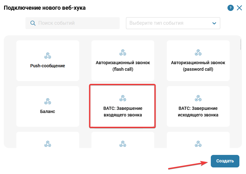 В появившемся окне выберите вариант “ВАТС: Завершение входящего звонка“ и нажмите на кнопку “Создать”.