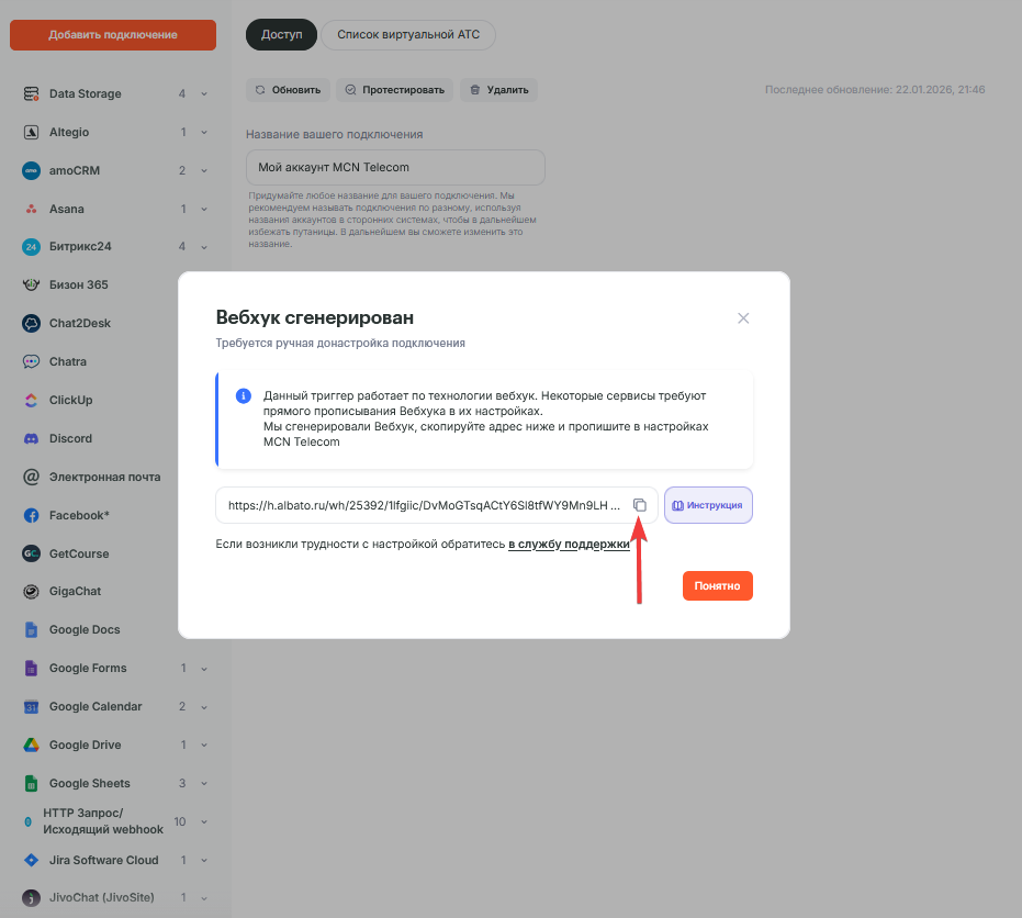 В открывшемся окне скопируйте полученный вебхук и вернитесь к сайту MCN Telecom.