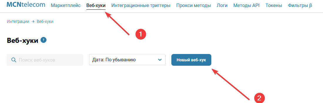 Откройте раздел “Вебхуки” и нажмите на кнопку “Новый вебхук”, чтобы указать полученные данные.