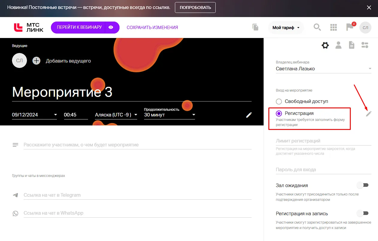- На платформе создать вебинар