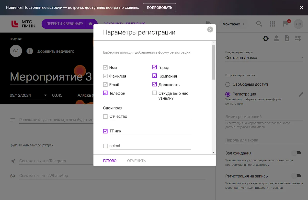 Алгоритм работы с дополнительными полями регистрации участника вебинара: