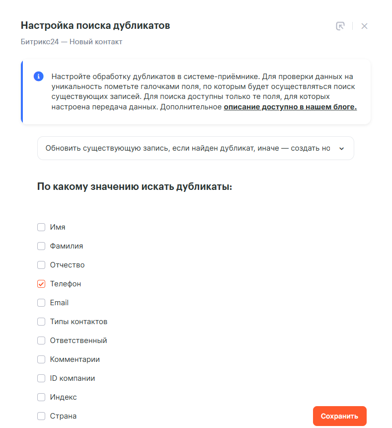 После сохранения прогресса, Albato предложит настроить обработку дубликатов. Инструкция по настройкам обработки дубликатов будет в конце этой инструкции. В нашем примере добавим обработку дубликатов по полю Телефон и выбрав опцию Обновить существующую запись, если найден дубликат, иначе создать новую запись.