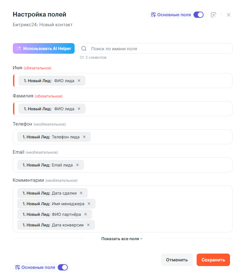 Так же заполним нужные вам поля, включая обязательные. Что бы связать контакт со сделкой, необходимо в шаге со сделкой в поле ID контакта передать переменную ID контакта от шага с контактом.
