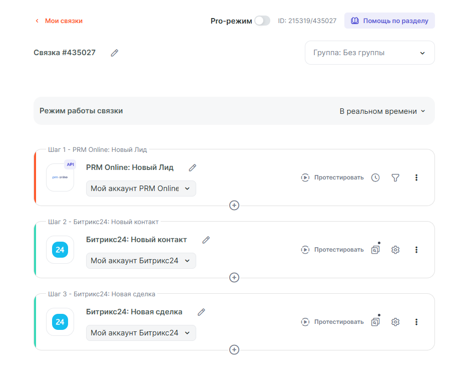 Следующим шагом рассмотрим простую интеграцию, которая позволит получать информацию о новом лиде в PRM Online и далее передавать о нём данные в Б24, создавая новый контакт и сделку.