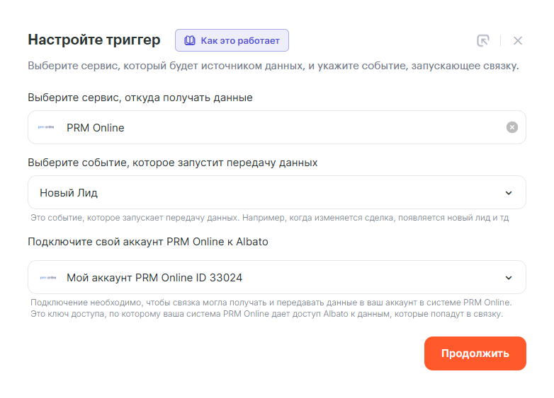 Подключение PRM Online к Albato и пример простой интеграции