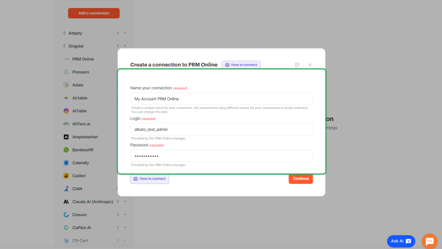 После нажатия на кнопку Добавить подключение, появится модальное окно с дополнительными настройками, в котором необходимо будет заполнить поле логин и пароль. Логин и Пароль в данном случае будут вашими авторизационными данными от аккаунта PRM Online